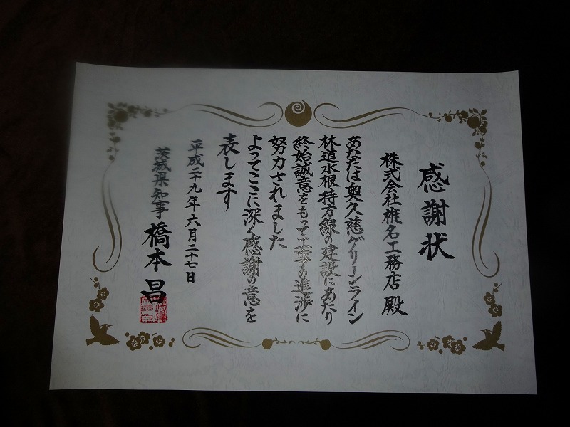 ◆奥久慈グリーンライン林道の開通式展に際し、茨城県知事より感謝状を拝受しました。